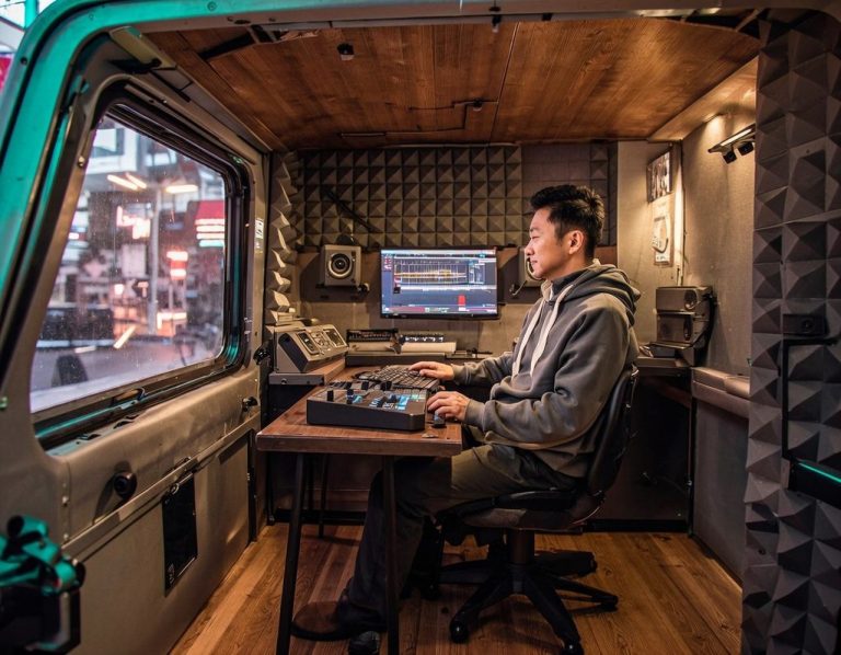 Un camion aménagé en studio professionnel, apportant la création artistique au plus près des jeunes.